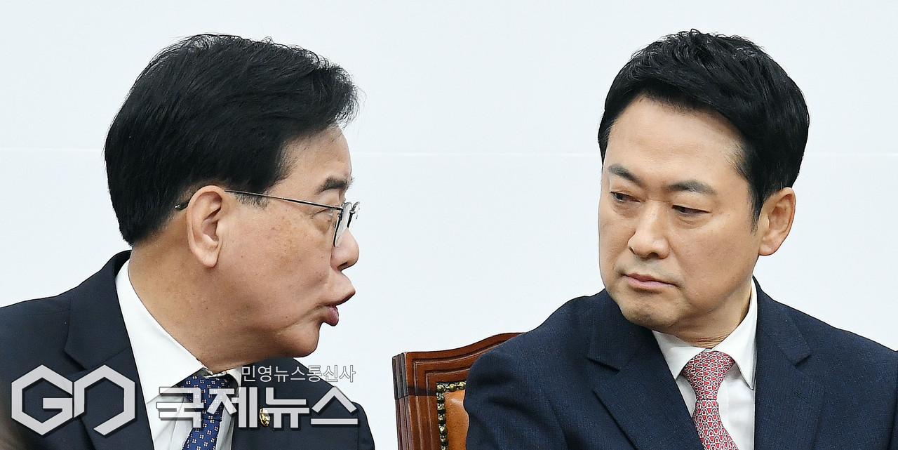 (서울=국제뉴스) 장동혁 국민의힘 대표가 16일 오전 서울 여의도 국회에서 열린 최고위원회의에서 송언석 원내대표와 대화하고 있다./사진=이용우 기자