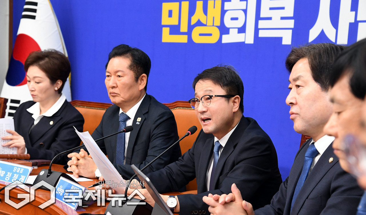 (서울=국제뉴스) 한병도 더불어민주당 원내대표가 16일 오전 서울 여의도 국회에서 열린 최고위원회의에서 발언을 하고 있다./사진=이용우 기자