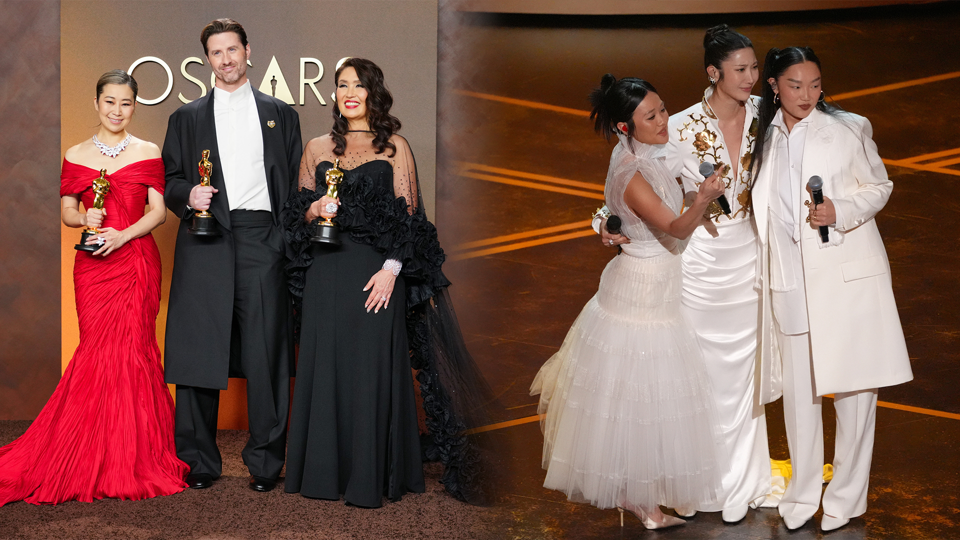 영화의 도입부를 그대로 무대로 옮겨온 듯한 축하 공연으로 한국 전통 무용을 결합한 퍼포먼스와 함께 가수 이재와 오드리 누나, 레이 아미는 주제가상을 받은 '골든'을 열창했습니다.