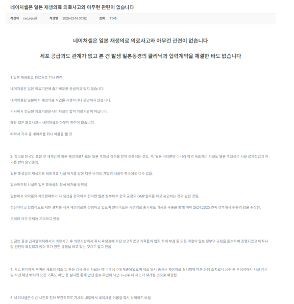 회사 측은 언론에 언급된 일본 의료기관이 네이처셀이 운영하거나 계약을 통해 의료행위를 수행하는 기관이 아니라고 설명했다.