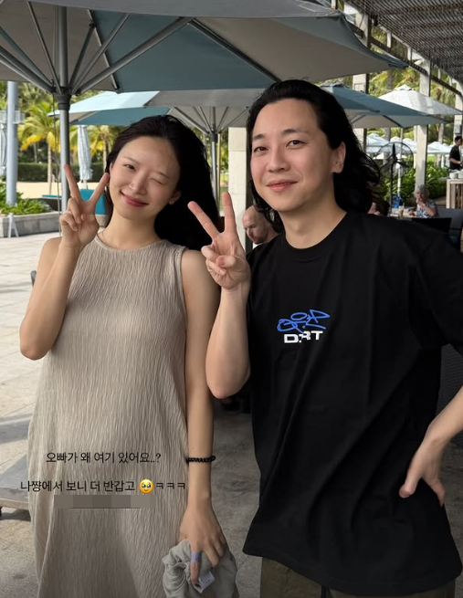 사진 속 김지영은 래퍼 넉살과 다정하게 브이 포즈를 취하며 셀카를 찍고 있다.