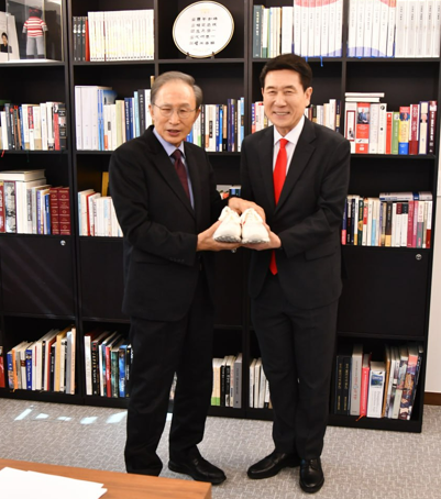 ▲이명박 전 대통령이 이강덕 경북도지사 예비후보에게 운동화를 선물하고 있다.ⓒ이강덕 예비후보 선거사무소 제공 |