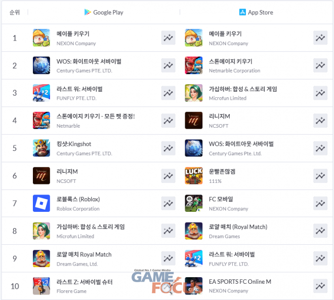 애플 앱스토어의 TOP 10 내에는 '키우기' 장르의 게임 2종이 선두 자리를 놓고 경쟁하는 가운데, '가십하버', '리니지M', '화이트아웃 서바이벌', '운빨존많겜', 'FC모바일', '로얄 매치', '라스트 워: 서바이벌', 'FC온라인M' 등 기존 인기작들의 순항이 이어지고 있다. '스톤에이지 키우기'가 가파른 상승세로 상위권에 안착해 1위 탈환을 노리고 있어 향후 경쟁 구도에 이목이 쏠린다.