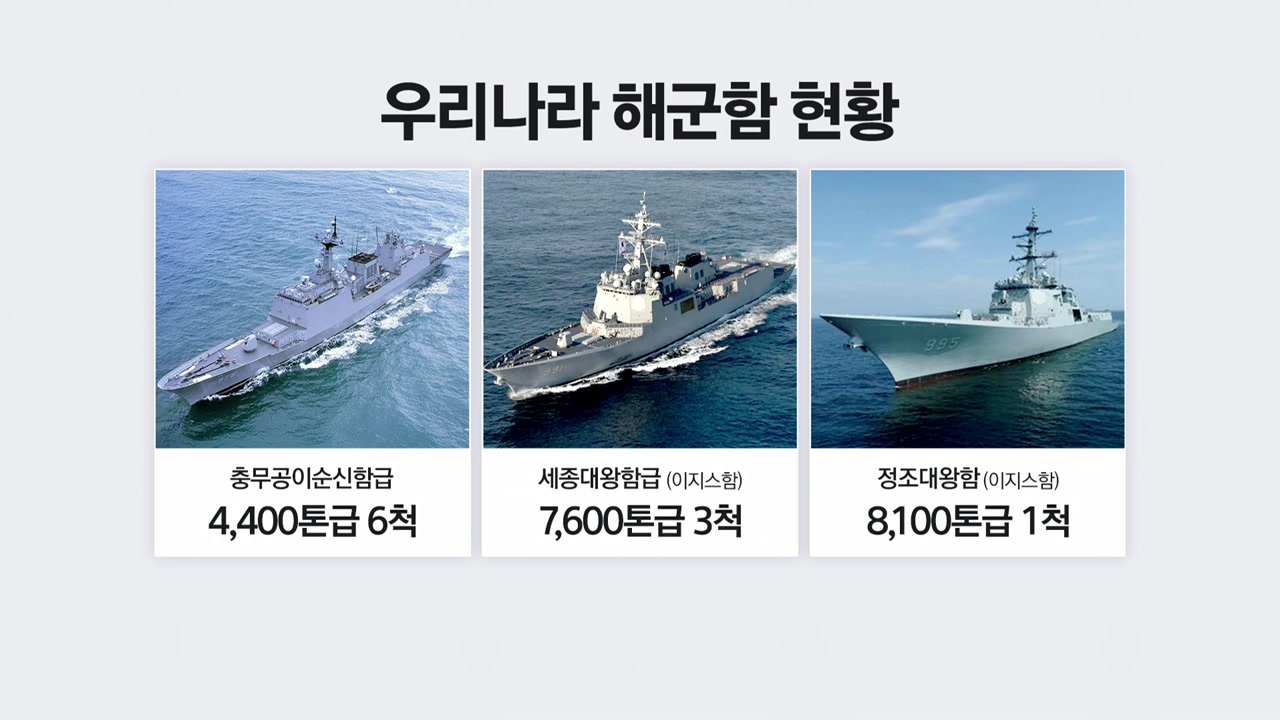우리 해군은 충무공이순신급 구축함 6척과 세종대왕급 이지스 구축함 3척, 정조대왕급 이지스 구축함 1척을 보유하고 있습니다.
