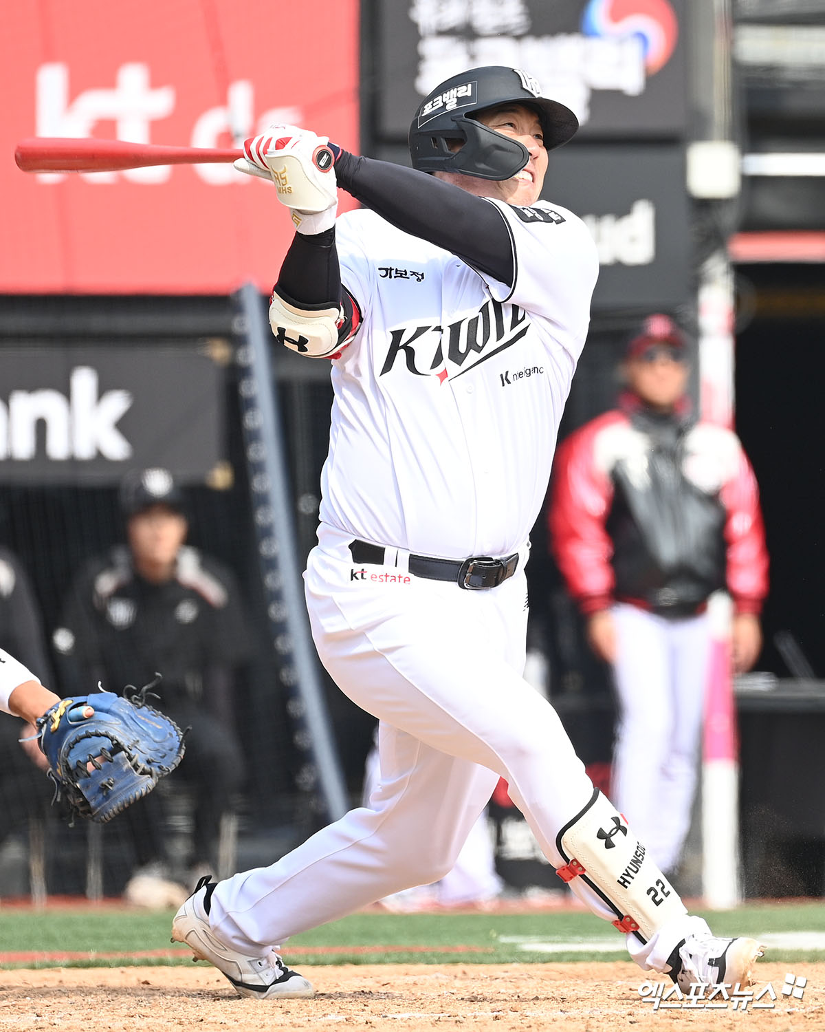 (엑스포츠뉴스 수원, 고아라 기자) 16일 오후 수원KT위즈파크에서 열린 ‘2026 신한 SOL KBO리그’ LG 트윈스와 KT 위즈의 시범경기, 4회말 2사 1,2루 KT 김현수가 타격하고 있다.