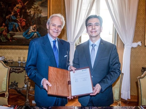 13일(현지시간) 이탈리아 로마에 위치한 위빌드 본사에서 이한우 현대건설 대표이사(오른쪽), 피에트로 살리니 위빌드 대표이사가 ‘대형 인프라 및 양수발전 등 에너지 사업협력에 관한 전략적 업무협약’ 체결 후 기념사진을 촬영하고 있다. 사진ㅣ현대건설 |