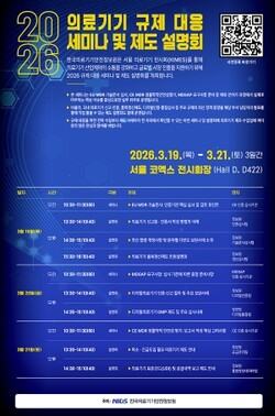 19일부터 21일까지 코엑스 전시장 Hall D422에서 진행되는 이번 행사는 최근 강화되고 있는 글로벌 의료기기 규제 환경에 대응해 유럽 CE MDR·의료기기 단일 심사 프로그램(Medical Device Single Audit Program·MDSAP) 등 해외 규제 대응 전략과 국내 인허가 제도 이해를 동시에 지원하기 위해 마련된다.