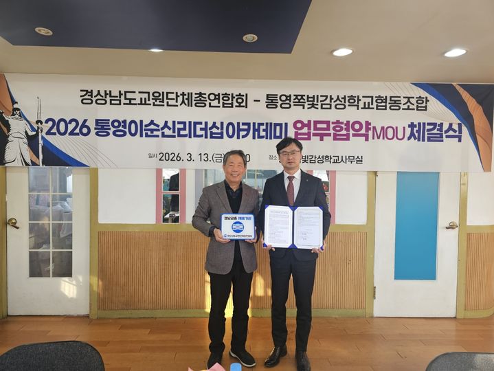 [창원=뉴시스] 김기진 기자 = 경상남도교원단체총연합회(회장 김광섭)는 통영쪽빛감성학교협동조합(대표 김순철) 과 2026통영이순신리더십아카데미의 효율적 운영을 위해 업무협약을 체결했다고 16일 밝혔다.
