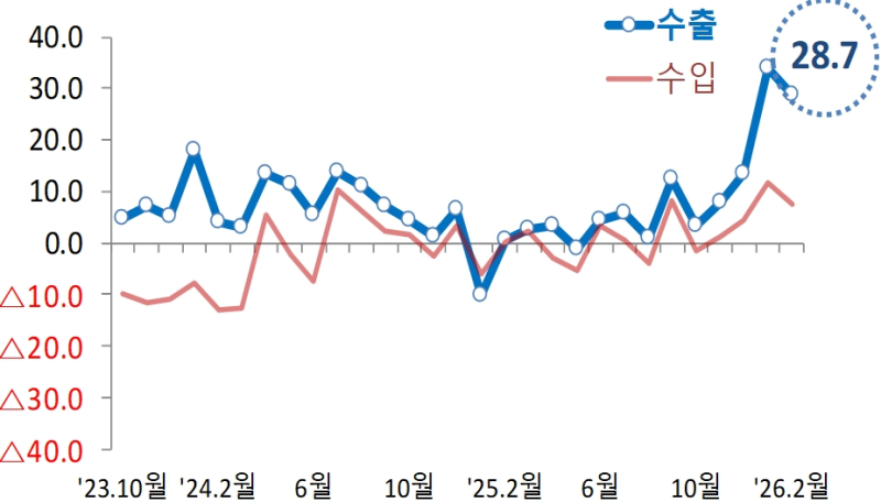 관세청이 16일 발표한 '2026년 2월 월간 수출입 현황(확정치)‘에 따르면 지난달 수출은 전년 동기대비 28.7% 증가한 673억 달러, 수입은 7.5% 증가한 519억 달러를 기록하며 13개월 연속 흑자행진을 이어갔다.