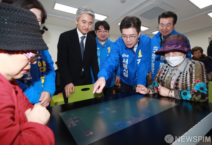 [서울=뉴스핌] 김현우 기자 = 정원오 더불어민주당 서울시장 예비후보가 16일 오후 서울 구로구 궁동종합사회복지관을 방문해 고스톱 기계를 살펴보고 있다. 2026.03.16 khwphoto@newspim.com