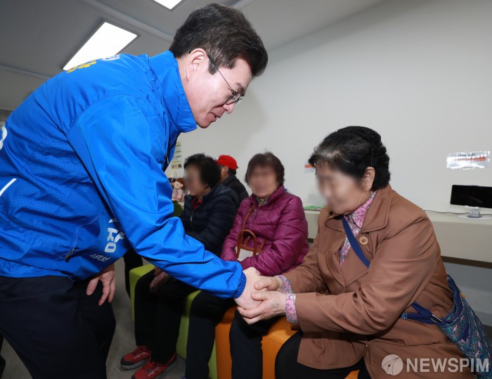 [서울=뉴스핌] 김현우 기자 = 정원오 더불어민주당 서울시장 예비후보가 16일 오후 서울 구로구 궁동종합사회복지관을 방문해 시민들과 인사를 나누고 있다. 2026.03.16 khwphoto@newspim.com