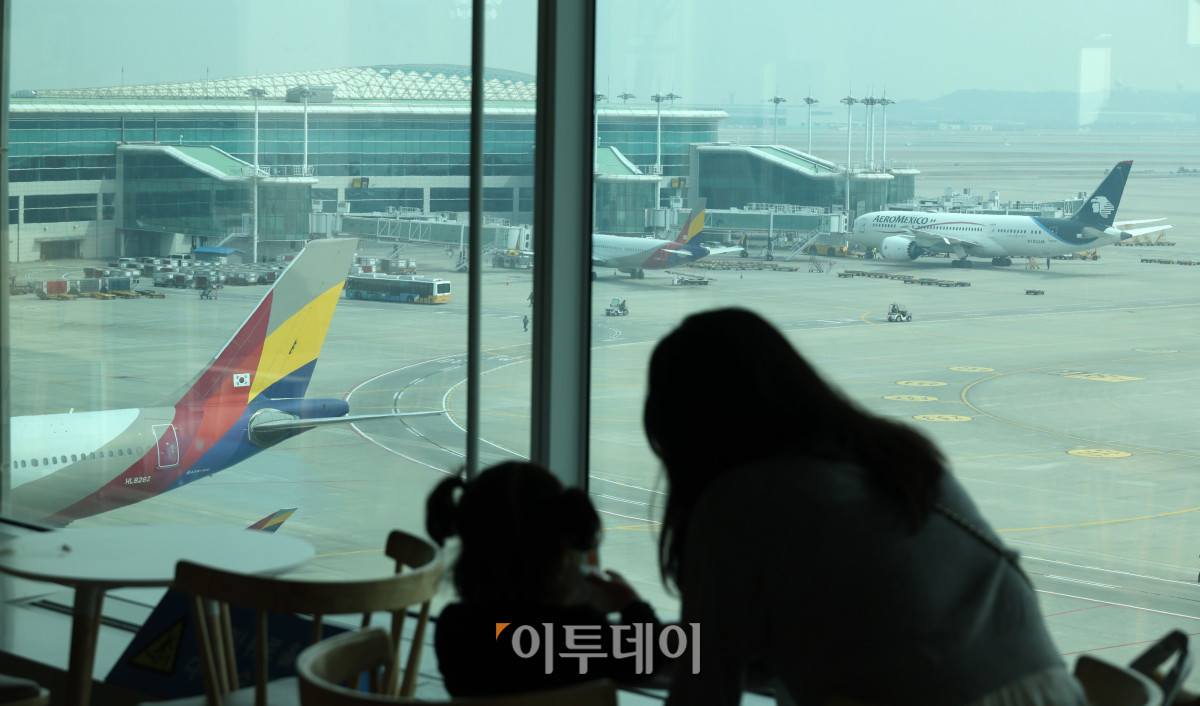 중동 사태로 국제유가와 환율이 오르면서 4월 국제선 항공권에 부과되는 유류할증료가 전월보다 큰 폭으로 인상돼 여행객들의 항공권 부담이 커질 전망이다. 이에 따라 국내 항공사들은 다음 달 발권하는 항공권에 붙는 유류할증료를 최대 3배 이상 올릴 방침이다. 16일 인천공항 전망대에서 시민들이 공항을 바라보고 있다. 고이란 기자 photoeran@ |