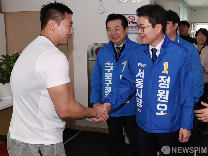 [서울=뉴스핌] 김현우 기자 = 정원오 더불어민주당 서울시장 예비후보가 16일 오후 서울 구로구 궁동종합사회복지관을 방문해 헬스트레이너와 인사를 나누고 있다.. 2026.03.16 khwphoto@newspim.com
