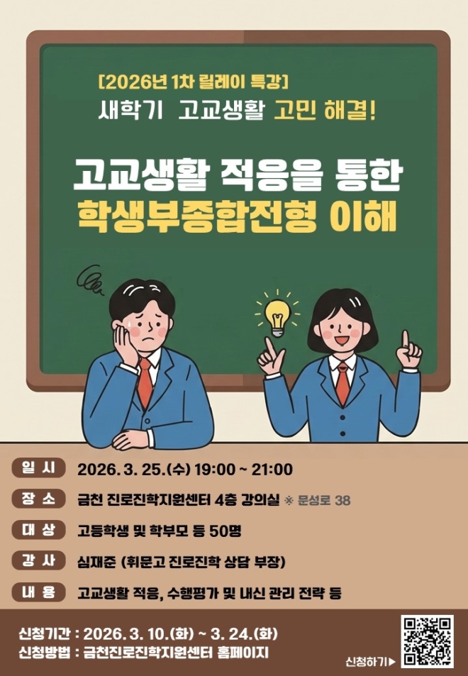 금천 진로 진학 지원센터에서 열리는 이번 특강은 고등학교에 진학했거나, 새 학년을 맞이한 학생이 학교생활에 적응하고 학생부종합전형을 대비해 수행평가를 관리할 수 있도록 마련됐다. 휘문고 심재준 진로 진학상담부장이 풍부한 현장 경험을 바탕으로 실질적인 정보를 제공할 예정이다. ▲고교 생활 적응 전략 ▲수행평가와 내신 관리 전략 ▲학생부종합전형 대비 중장기 전략 세우기 등을 구체적으로 안내한다.