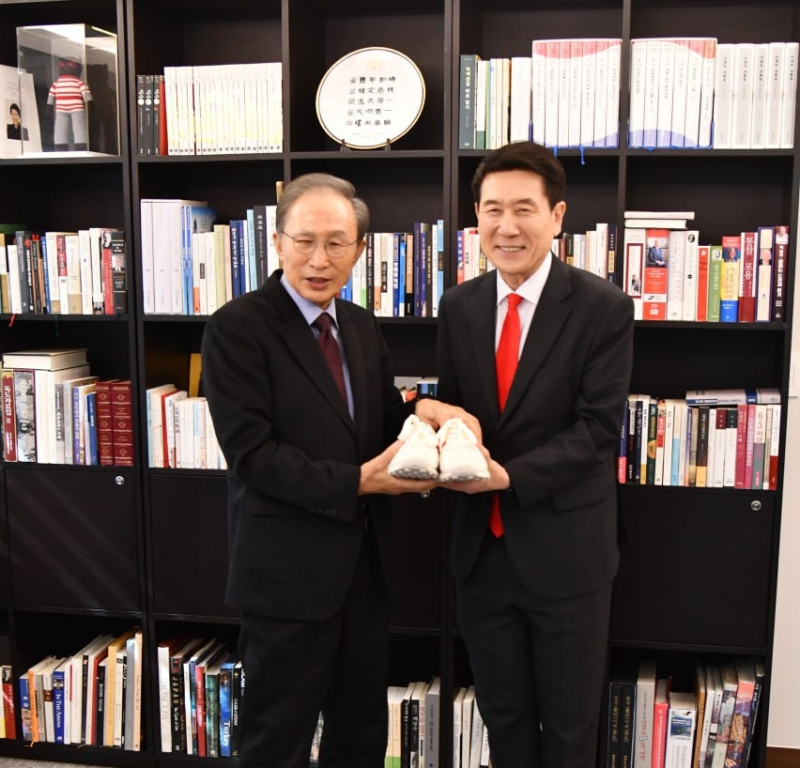 이명박 전 대통령이 이강덕 국민의힘 경북도지사 예비후보에게 운동화를 선물하며 지지의사를 밝혔다. 이강덕 예비후보 제공 |