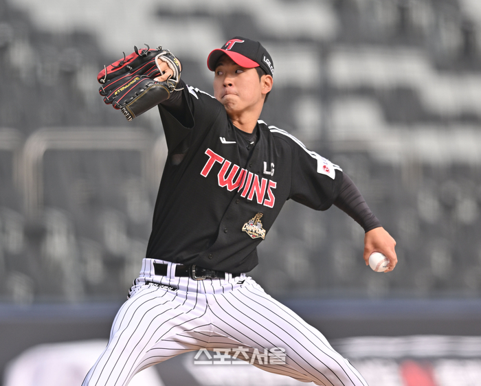 LG 투수 조건희가 16일 수원 KT위즈파크에서 열린 2026 KBO리그 KT와 시범경기 7회 역투하고 있다.