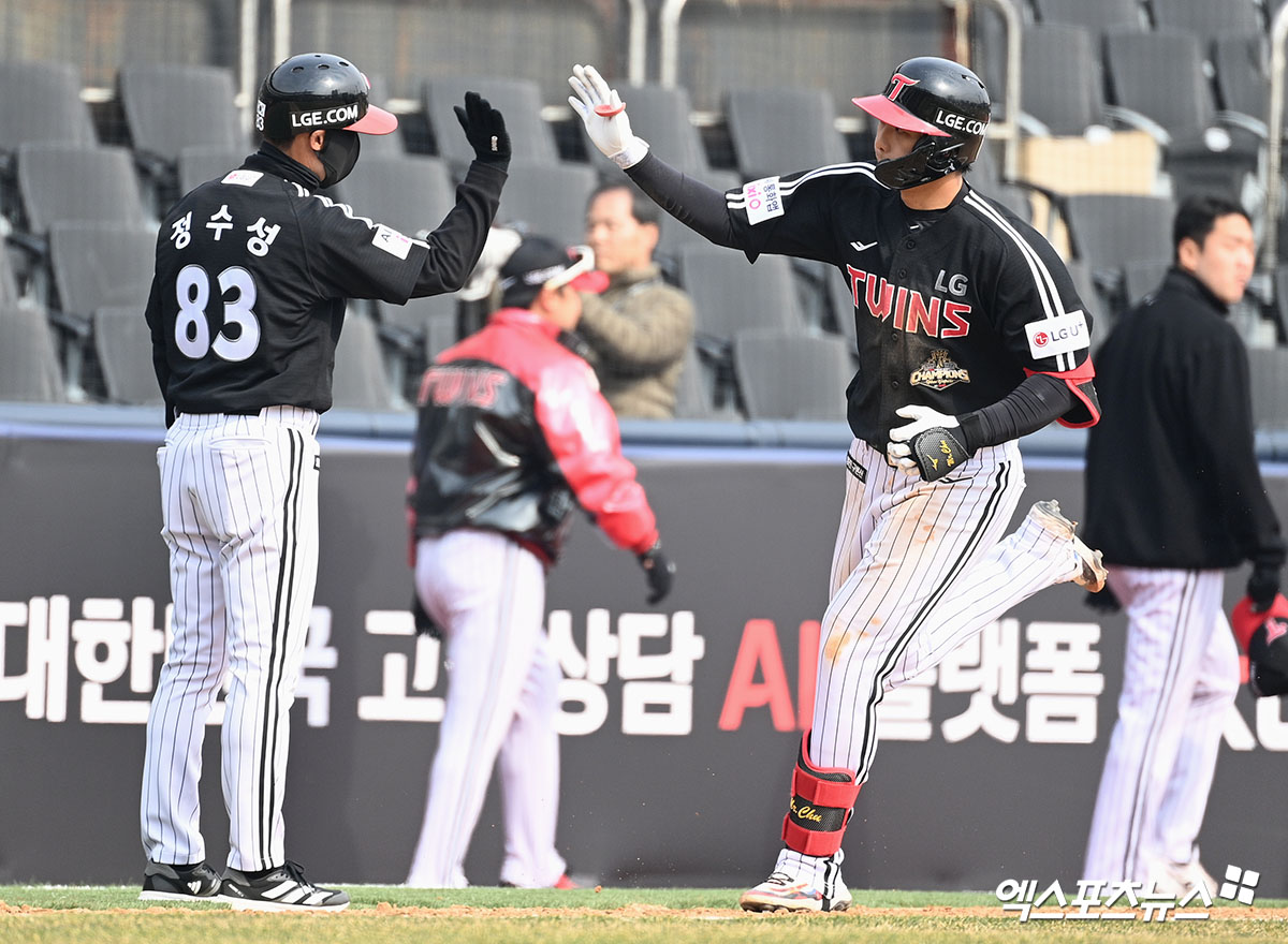 (엑스포츠뉴스 수원, 고아라 기자) 16일 오후 수원KT위즈파크에서 열린 ‘2026 신한 SOL KBO리그’ LG 트윈스와 KT 위즈의 시범경기, 6회초 무사 2루 LG 추세현이 홈런을 날린 뒤 정수성 코치와 세리머니를 하고 있다.