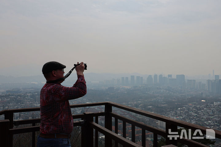 [서울=뉴시스] 권창회 기자 = 초미세먼지 농도가 '나쁨' 상태를 보인 16일 서울 용산구 남산공원에서 바라본 시내가 뿌옇다. 2026.03.16. kch0523@newsis.com |