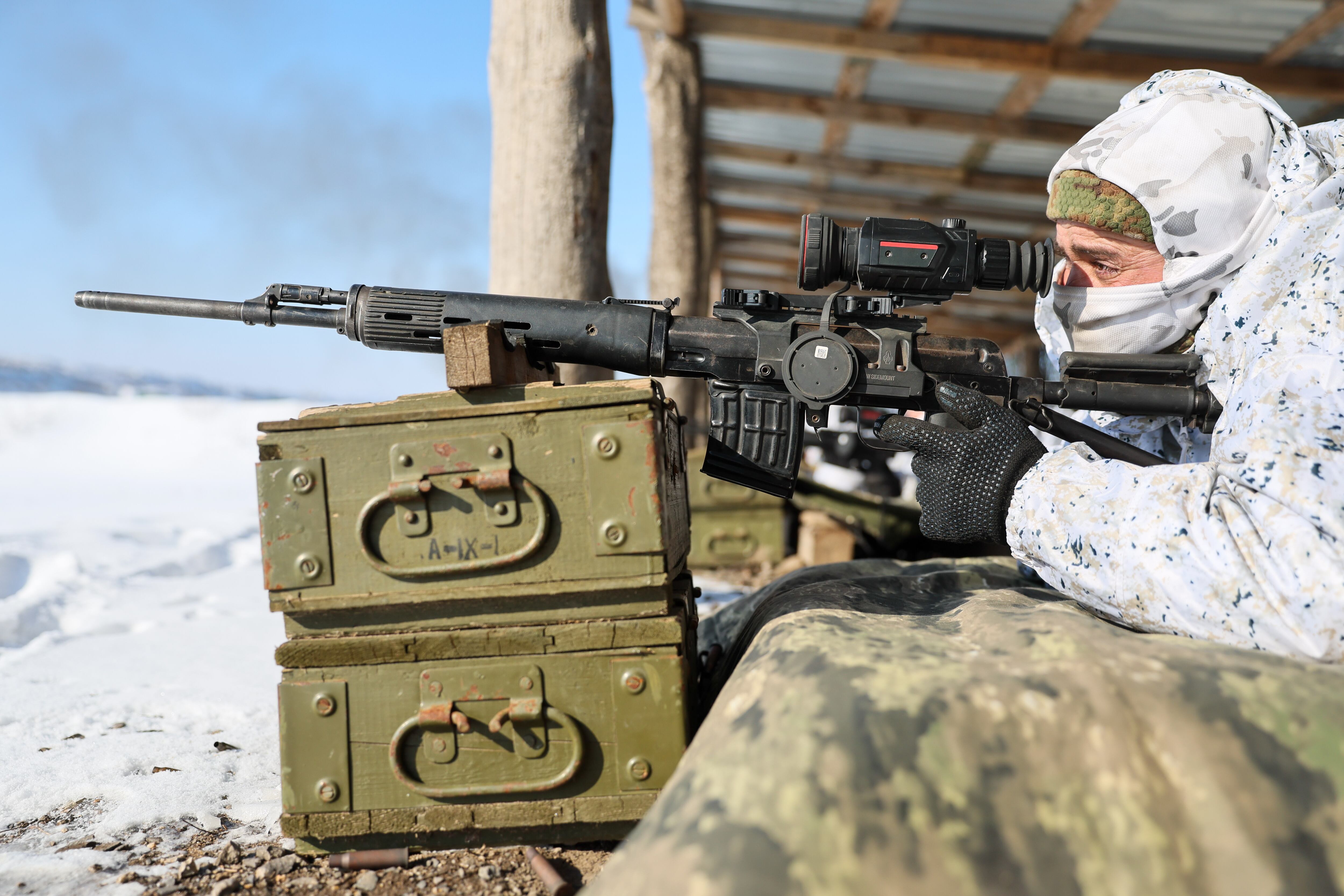 러시아 도네츠크 인민공화국 중앙부대 소속 알렉산더 자하르첸코가 군사 훈련장에서 저격총을 겨누고 있다. /연합뉴스 |