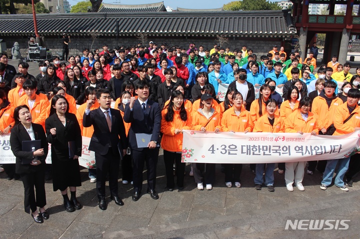 [제주=뉴시스] 양영전 기자 = 제주대학교·제주관광대학교·제주국제대학교·제주한라대학교 학생들이 1일 오후 제주시 삼도이동 관덕정 앞에서 제주4·3 75주년을 맞아 공동성명문을 발표한 뒤 구호를 외치고 있다. 이들은 성명문 발표 이후 제주시청 어울림마당까지 걷는 4·3평화대행진을 진행했다. 2023.04.01. 0jeoni@newsis.com |