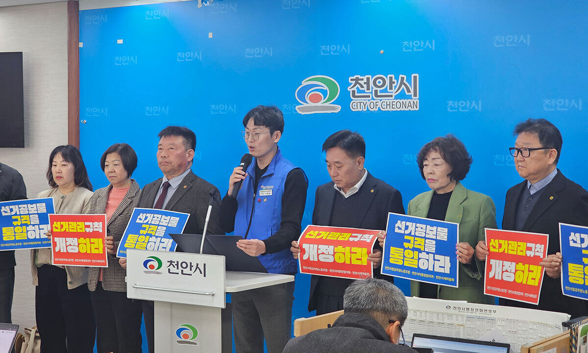 천안시청공무원노동조합과 천안시새마을회, 천안시이통장협의회는 16일 천안시청에서 기자회견을 열고 중앙선거관리위원회를 향해 선거공보 규격 통일을 위한 선거관리규칙 개정을 촉구했다.