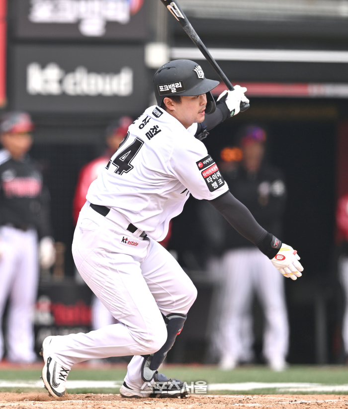 KT 문상철이 16일 수원 KT위즈파크에서 열린 2026 KBO리그 LG와 시범경기 7회말 1사만루 병살타를 치고 있다.
