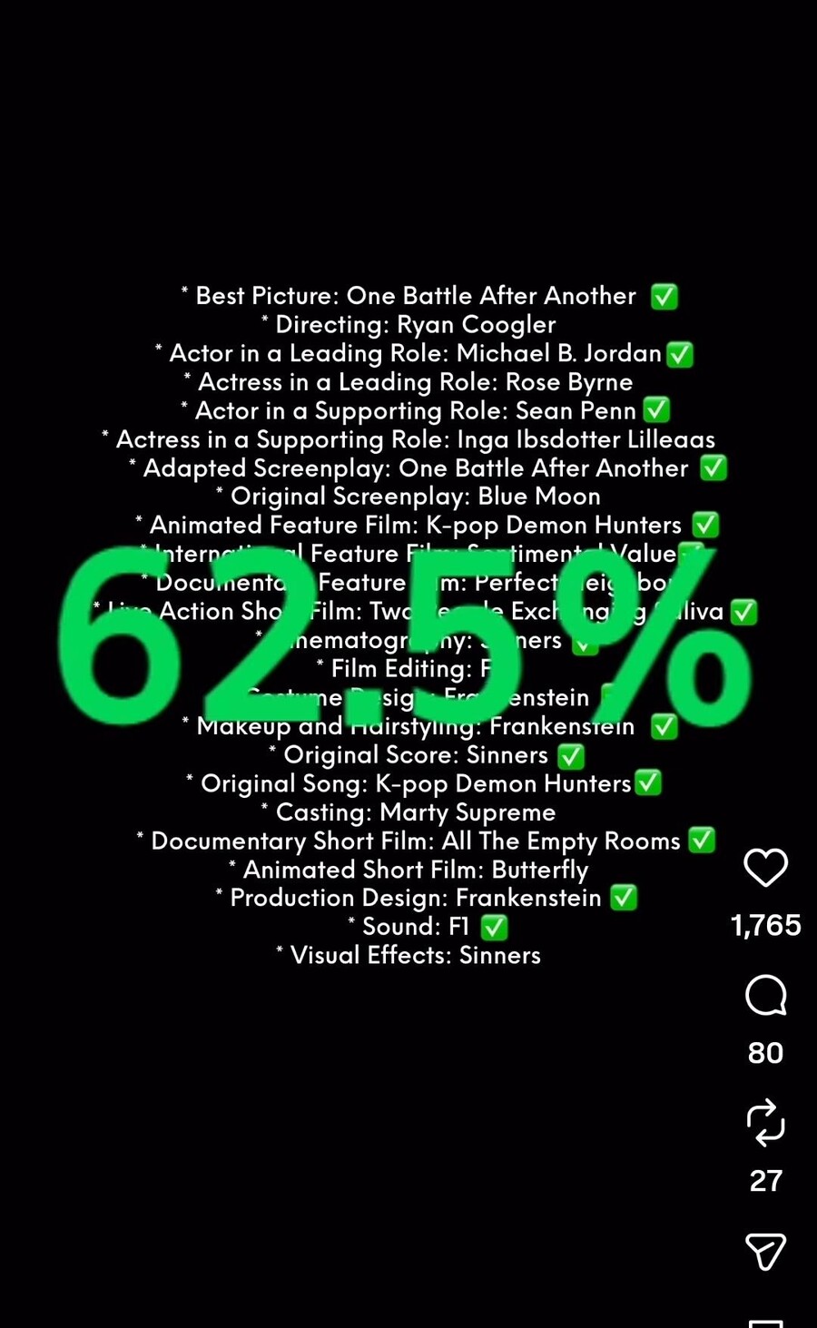 한편 15일(현지 시간) 미국 로스앤젤레스 돌비 극장에서 진행된 제98회 아카데미 시상식에서는 폴 토마스 앤더슨 감독의 '원 배틀 애프터 어나더'가 작품상 등 최다인 6관왕을 차지했다. 또 넷플릭스 애니메이션 '케이팝 데몬 헌터스'가 장편 애니메이션상과 주제가상('골든')을 수상하며 2관왕에 올랐다.