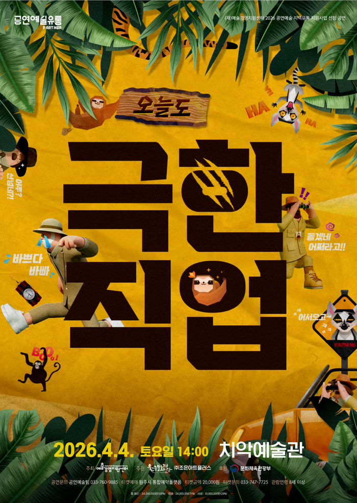 [스포츠서울ㅣ원주=김기원 기자]원주문화재단이 오는 4월 4일(토) 오후 2시 치악예술관에서 2026 기획공연 ‘오늘도 극한직업’을 선보인다. 2026 공연예술 지역 유통지원 사업 선정공연으로, 예술경영지원센터가 주최하고 원주문화재단과 ㈜조은아트플러스가 공동 주관하며 문화체육관광부가 후원한다.
