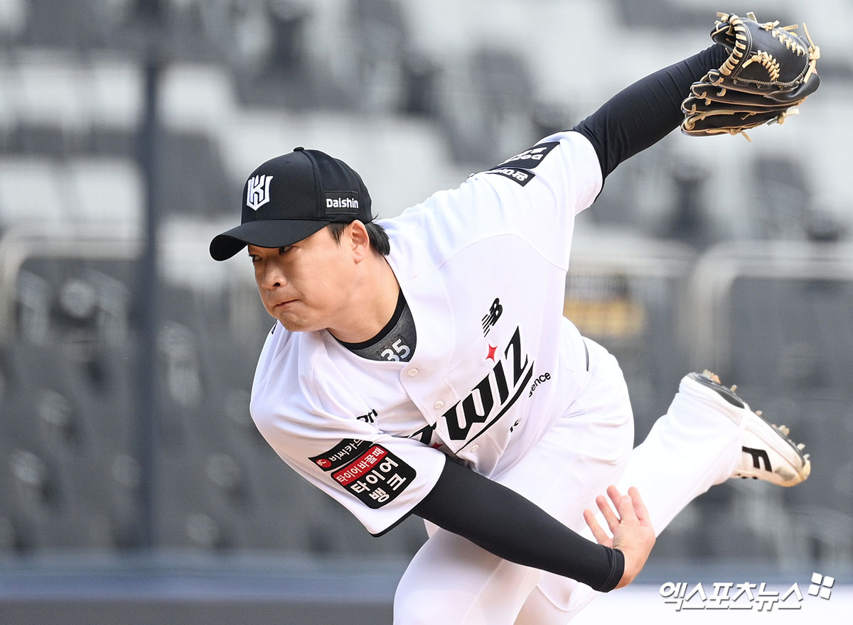 (엑스포츠뉴스 수원, 고아라 기자) 16일 오후 수원KT위즈파크에서 열린 ‘2026 신한 SOL KBO리그’ LG 트윈스와 KT 위즈의 시범경기, 8회초 KT 한승혁이 공을 힘차게 던지고 있다.