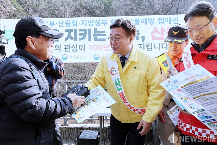 [서울=뉴스핌] 윤호중 행정안전부 장관이 16일 오전 대구광역시 남구 앞산공원에서 산불예방 현장 캠페인에 참여하고 있다. [사진=행정안전부] 2026.03.16 photo@newspim.com