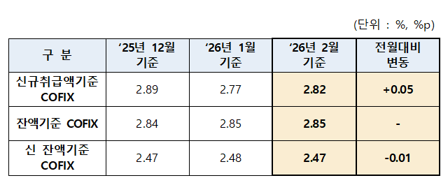 19일 은행연합회에 따르면 올해 2월 신규 취급액 기준 코픽스는 2.82%로 집계됐다. 전월(2.77%)보다 0.05%포인트(p) 상승했다. 지난달 하락했던 코픽스가 한 달 만에 다시 반등한 것이다.