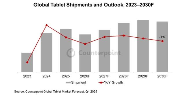 16일 카운터포인트리서치의 최신 글로벌 태블릿 시장 트래커에 따르면, 지난해 4분기 글로벌 태블릿 출하량은 전분기 대비 3%, 전년 동기 대비 4% 감소했다. 이는 3분기 상대적으로 강한 출하 이후 시장이 정상화 국면에 진입한 영향으로 분석된다.