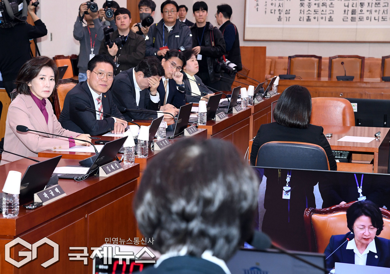 (서울=국제뉴스) 16일 오후 서울 여의도 국회에서 열린 법제사법위원회 전체회의에서 추미애 위원장이 정회를 선포하자 국민의힘 의원들이 묵언의 항의하고 있다./사진=이용우 기자
