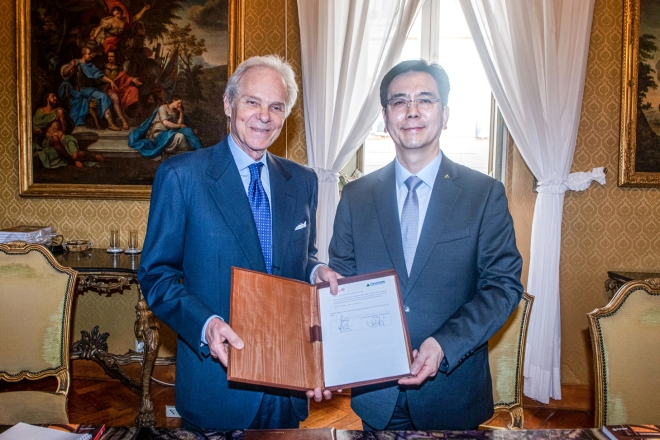 이한우(오른쪽) 현대건설 대표이사와 피에트로 살리니 위빌드 대표이사가 13일(현지시간) 이탈리아 로마에 위치한 위빌드 본사에서 ‘대형 인프라 및 양수발전 등 에너지 사업 협력에 관한 전략적 업무협약’ 체결 후 기념사진을 촬영하고 있다. 현대건설 제공 |