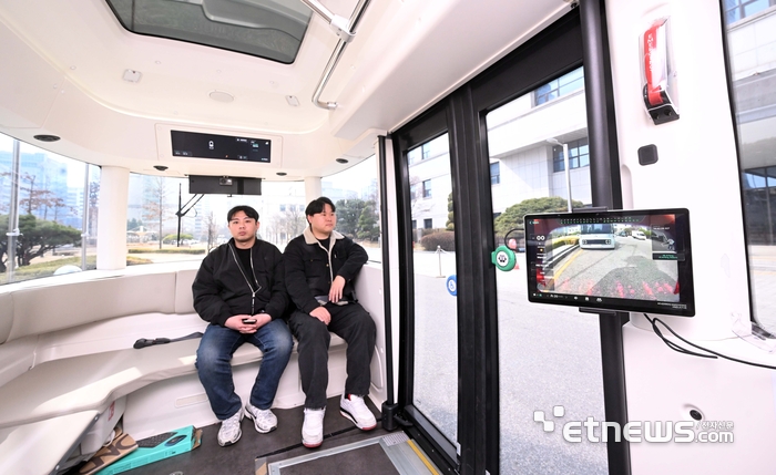 안양시가 운전석 없는 '레벨4 자율주행 셔틀'을 도입하고 시민 체험 운행을 개시했다. 16일 경기도 안양시청에서 오토노머스에이투치 연구원들이 차량 시승을 하고 있다.