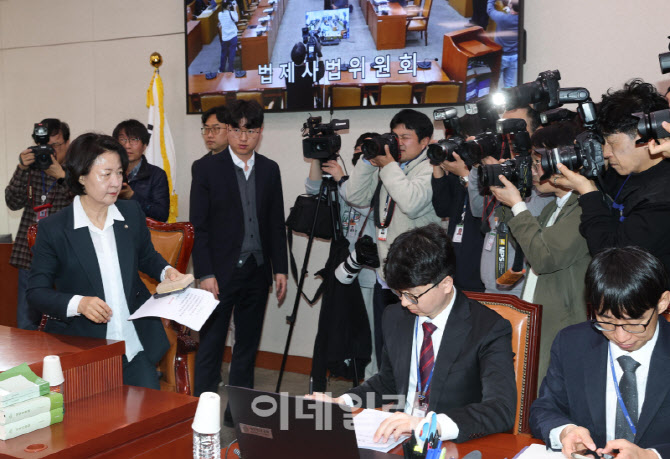 [이데일리 노진환 기자] 추미애 국회 법제사법위원장이 16일 오후 서울 여의도 국회에서 열린 법제사법위원회 전체회의에서 정회를 선언하며 회의실을 나가고 있다. |