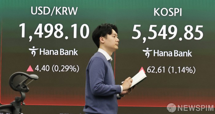 [서울=뉴스핌] 양윤모 기자= 16일 오후 코스피가 전장 종가보다 62.61 포인트(1.14%) 상승하며 5549.85로, 코스닥은 14.67 포인트(1.27%) 하락한 1138.29로 거래를 마감한 가운데, 서울 중구 하나은행 을지로본점 딜링룸에서 직원들이 업무를 보고 있다. 서울외환시장에서 달러/원 환율은 전장 대비 4.40원 상승한 1498.10원에 주간거래를 마감했다. 2026.03.16 yym58@newspim.com