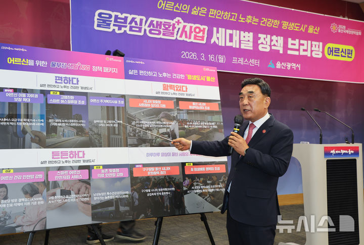 [울산=뉴시스] 배병수 기자 = 김두겸 울산시장이 16일 시청 프레스센터에서 정책 보고회를 열고 고령사회에 선제적으로 대응하기 위한 생활·건강·여가 등 3대 분야 중심의 '울부심 생활플러스' 어르신 맞춤형 지원정책을 발표하고 있다. 2026.03.16. bbs@newsis.com |
