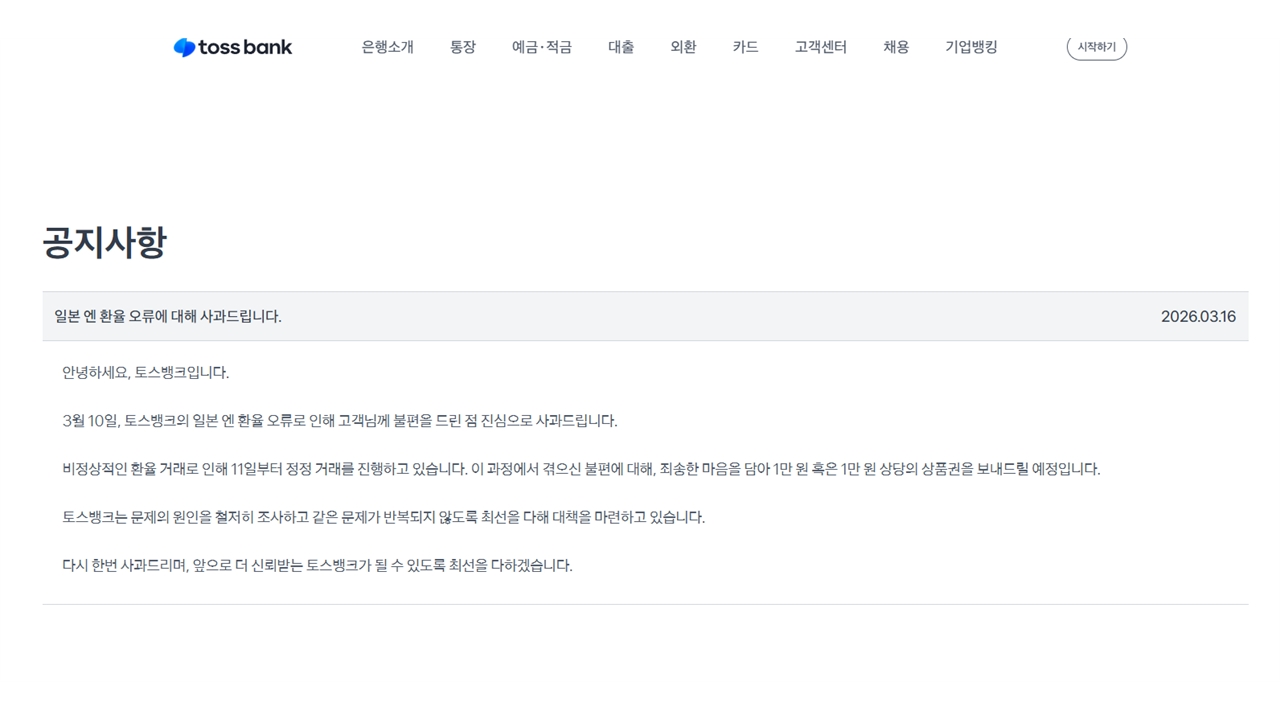 인터넷전문은행 토스뱅크는 지난주 발생한 엔화 환전 오류 보상 조치로 해당 시간대에 거래한 고객에게 현금 만 원씩을 지급한다고 밝혔습니다.