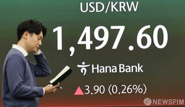 [서울=뉴스핌] 양윤모 기자= 중동 사태 여파로 달러/원 평균 환율이 외환위기 이후 가장 높은 수준을 기록한 16일 오후 서울외환시장에서 전장 대비 3.90원 상승한 1497.60원에 주간거래를 마감한 가운데, 서울 중구 하나은행 을지로본점 딜링룸에서 직원들이 업무를 보고 있다. 2026.03.16 yym58@newspim.com