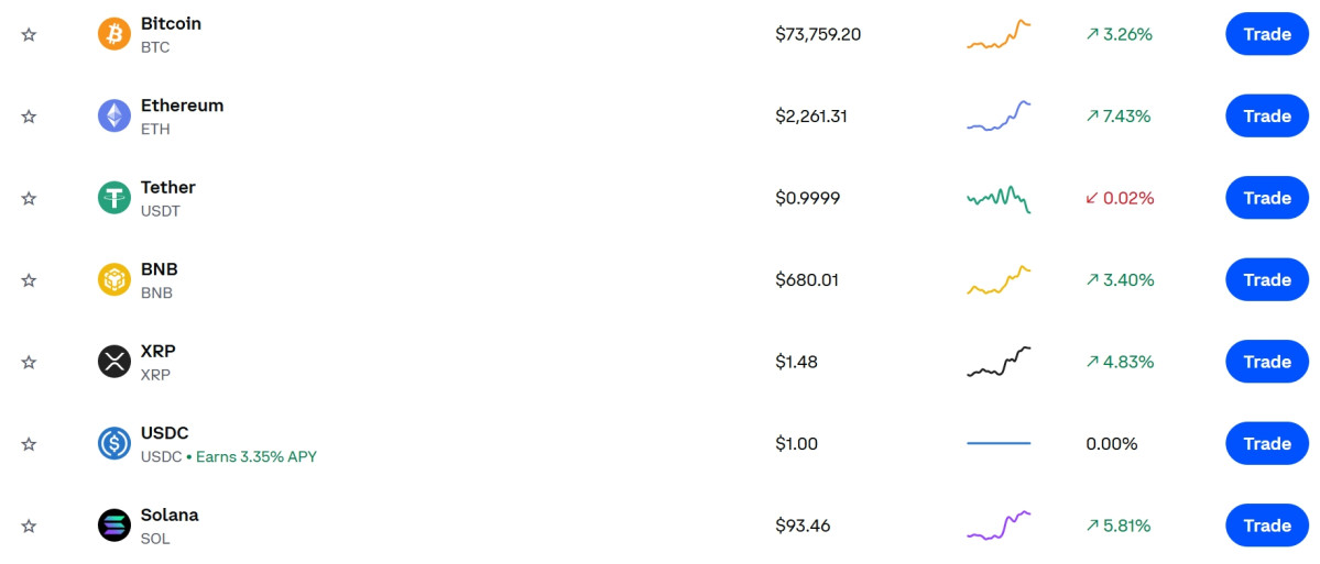 글로벌 거래소 코인베이스에 따르면 한국시간 16일 오후 4시 기준 비트코인(BTC)은 약 7만3759달러 수준에서 거래되며 3%대 상승률을 기록했다. 장중 한때 7만4000달러선을 회복하며 강세 흐름을 이어가고 있다.