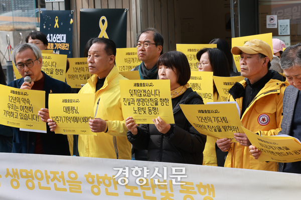 4·16세월호참사가족협의회와 4월16일의약속국민연대는 16일 오전 서울 중구 서울시의회 세월호 기억공간 앞에서 ‘4·16 세월호 참사 12주기 기억과 약속의 달 선포 기자회견’을 열었다.