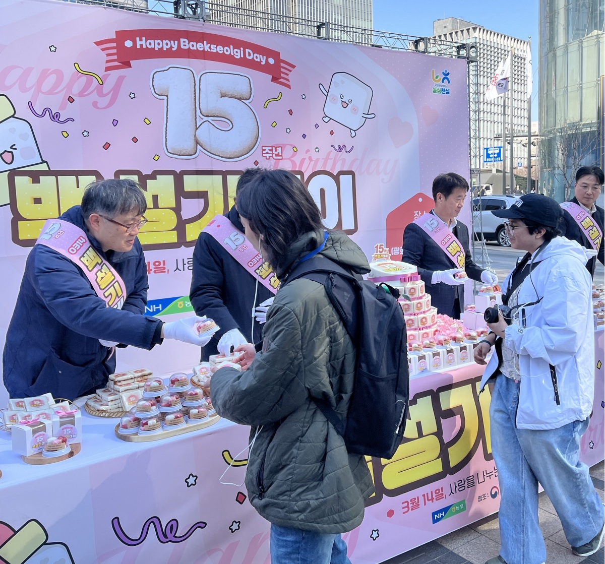 현장에서는 ▲시민 대상 하트 백설기 증정 ▲백설기데이 15주년 기념 대형 백설기 케이크 커팅식 ▲3월 14일 생일자 축하 이벤트 등이 진행됐다.
