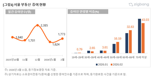 증여인의 연령 구조를 보면 변화가 감지된다. 서울 증여인의 연령 비중은 ▲40대 3.61% ▲50대 16.19% ▲60대 32.83% ▲70대 이상 43.03%로 나타났다. 단일 연령대 기준으로는 70대 이상 고령층 비중이 가장 높지만 50~60대 참여가 확대된 모습이다.