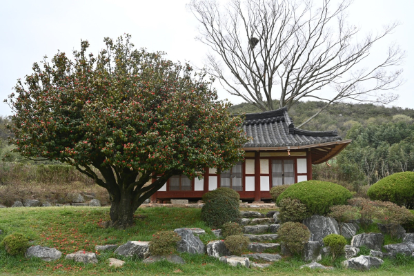 금사정 옆에 자리한 동백나무는 높이 약 6m, 줄기 둘레 2.4m에 이르는 거목으로 국내 동백나무 가운데서도 규모와 수형이 뛰어나 2009년 천연기념물 제515호로 지정됐습니다.