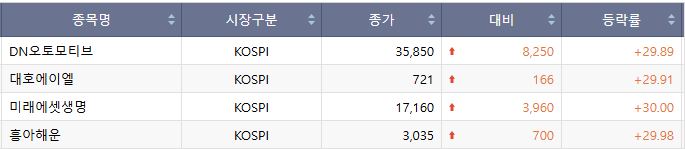 16일 한국거래소에 따르면 코스피 시장에서 상한가를 기록한 종목은 DN오토모티브, 대호에이엘, 미래에셋생명, 흥아해운이다.