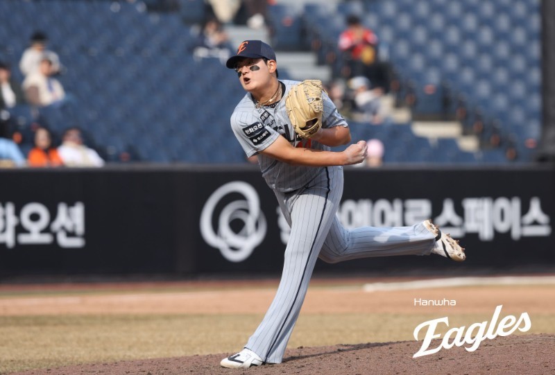 [대전=뉴스핌] 한화 이민우가 16일 대전 한화생명 볼파크에서 열린 두산 베어스와의 2026 KBO 시범경기에서 공을 뿌리고 있다. [사진=한화] 2026.03.16 football1229@newspim.com |