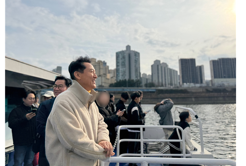 오세훈 서울시장이 지난 1일 재운항을 시작한 한강버스에 탑승해 옥수 선착장을 바라보고 있다. 서울시 제공 |