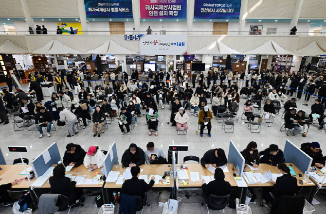 16일 오전 인천시청 본관 1층 로비에 마련된 천원주택 신청 접수 현장에 신혼부부 등 시민 수백명이 모여 순서를 기다리고 있다. (사진 = 인천시 제공) |