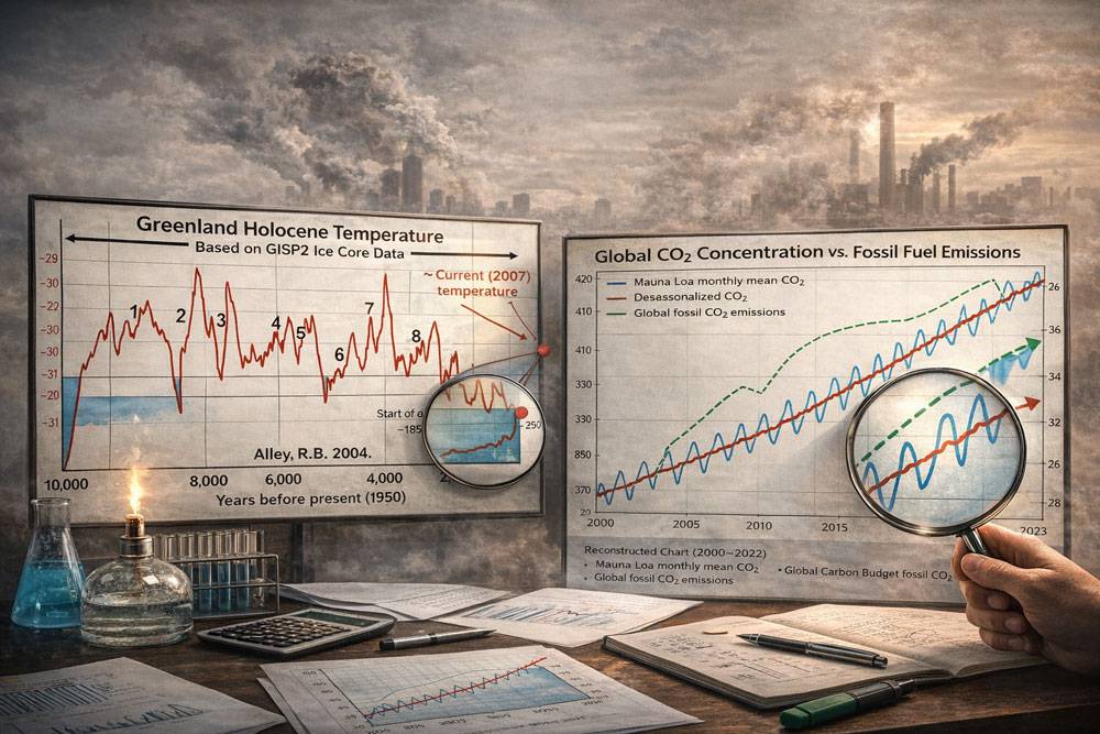 이 그래프가 그린란드 중앙부라는 특정 지점의 기록이라는 점도 기억해야 한다. 북극권은 지구 평균보다 온도 변화 폭이 2~3배가량 더 민감하게 나타나는 지역이다. 과거 특정 시기에 그린란드가 일시적으로 따뜻했을 수는 있지만, 이를 지구 전체의 현상으로 일반화하기에는 무리가 따른다. 반면 수천 개의 지표 및 해양 데이터를 종합해 복원한 ‘전 지구 평균 기온(하키스틱 그래프)’을 보면 양상이 전혀 다르다. 지난 2,000년 동안 비교적 안정적이었던 지구 기온은 산업화 이후 약 1.1°C에서 1.2°C가량 수직 상승했다. 특정 지역의 과거 기록보다는 지구 전체의 평균적인 흐름을 보는 것이 기후 변화의 실체를 이해하는 데 훨씬 적합하다.탄소 농도가 쉽게 꺾이지 않는 이유